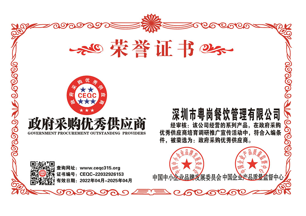 深圳市粵崗餐飲管理有限公司,是一家集蔬菜種植和農(nóng)副產(chǎn)品配送為一體的專業(yè)型餐飲公司,主要為學(xué)校、工廠企事業(yè)機(jī)關(guān)單位提供蔬菜和農(nóng)副產(chǎn)品配送服務(wù)。公司自成立以來始終以質(zhì)優(yōu)價(jià)廉、服務(wù)至上為原則,嚴(yán)格按照ISO:9001國(guó)際標(biāo)準(zhǔn)體系進(jìn)行管理。同時(shí)建立了行業(yè)領(lǐng)先的配送中心、大型冷庫和保鮮庫、檢測(cè)中心以及專業(yè)化的配送團(tuán)隊(duì),能長(zhǎng)期安全、穩(wěn)定、準(zhǔn)時(shí)的配送貨物。我們所有蔬菜均經(jīng)過初步加工、無黃葉,無泥沙等雜質(zhì),利用率達(dá)97%以上...保障向用戶提供的各類食材的衛(wèi)生和質(zhì)量。公司為了適應(yīng)不同客戶的需求,配有專業(yè)人員和配送車輛,實(shí)行“一對(duì)一”的服務(wù)體制,一心一意的為客戶服務(wù),秉承粵崗誠(chéng)實(shí)守信、服務(wù)第一、客戶至上的服務(wù)標(biāo)準(zhǔn),真正讓客戶花最少的錢吃最好的菜。粵崗多年來何以欣欣向榮,因?yàn)槲覀冎乐挥杏掠趽?dān)當(dāng)責(zé)任,才能承擔(dān)更大的責(zé)任,就是因?yàn)?粵崗員工貫徹公司態(tài)度決定一切、細(xì)節(jié)決定成敗的真理,從質(zhì)量抓起,從服務(wù)做起,才創(chuàng)造了如今的規(guī)模化供應(yīng)、統(tǒng)一性配送、專業(yè)化服務(wù)的粵崗。